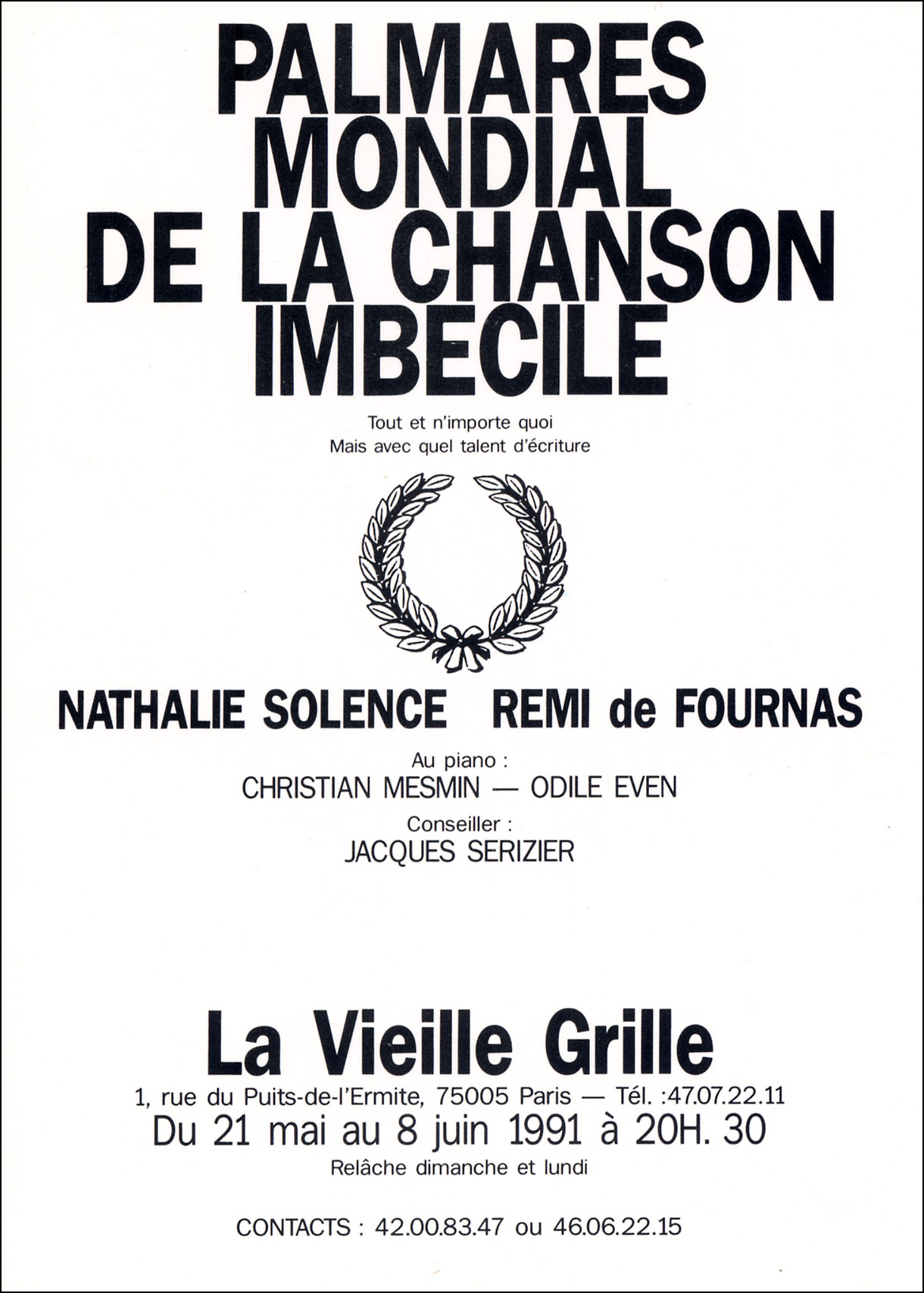 1991 Palmarès mondial de la chanson imbécile avec Rémi de Fournas, piano Christian Mesmin puis Paul Castanier – La Vieille Grille, Paris, et régions