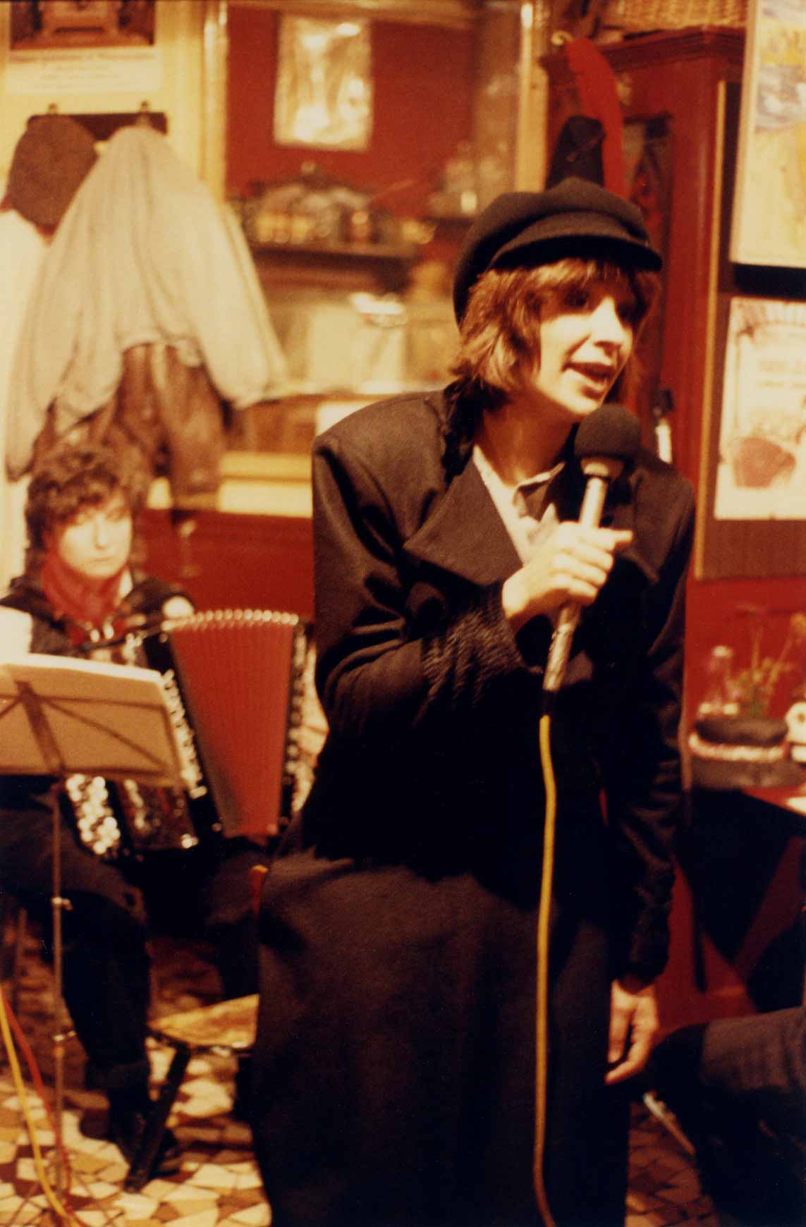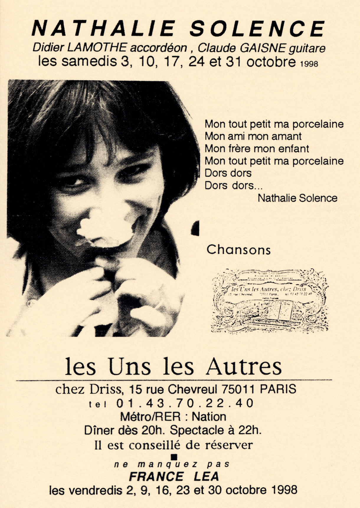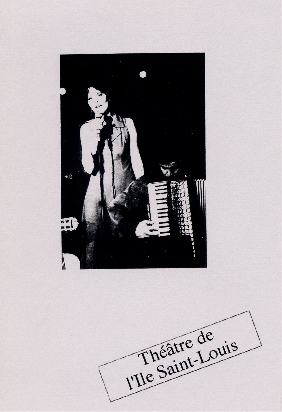 , Le Limonaire, Les Uns les Autres, La Tanière, Peinture Fraîche, Le Cithéa, La Vieille Grille, Le Bateau Ivre, Le Caf’ Monge, L’Écume, les cafés-chantant de Cultures au Quotidien (Merle Moqueur, Mouette Rieuse, Folie en tête) L’Hôtel Royal Monceau, participation aux galas de Jacques Serizier à La Mutualité (1987) et au TLP Déjazet (1988), gala de sortie du CD Dans la maison blanche au music-hall Les Étoiles (1995), gala de l’Union pacifiste au Théâtre Dunois, Le Movie’s, L’Espace Laser, L’Espace Chanson, Le Théâtre Arcane, Le Téléphone, Le Salicorne, Centre Jean Verdier, Le Théâtre Galabru, Les Quarts d’heure…
