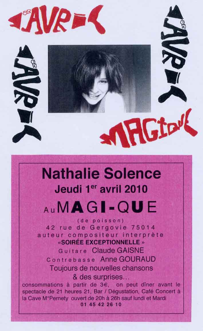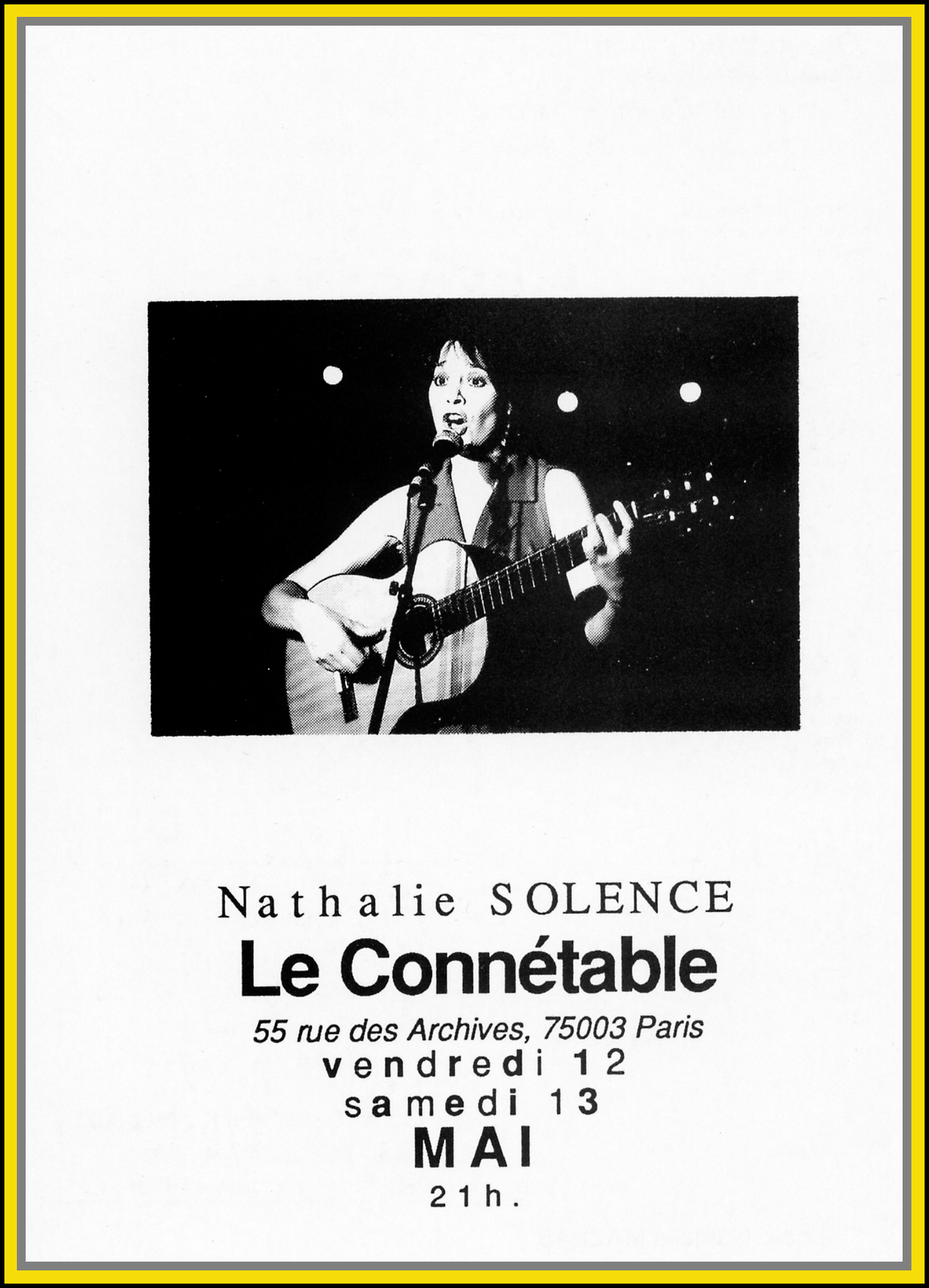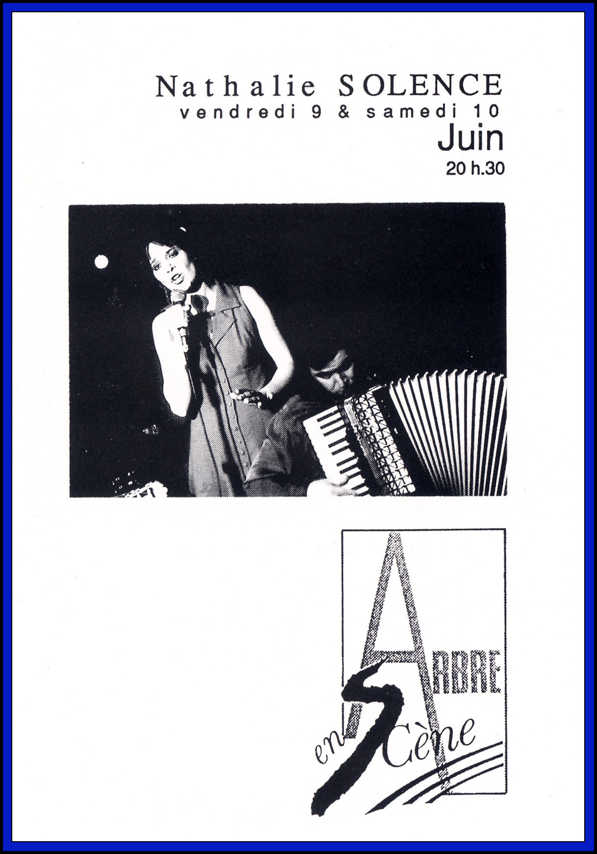 , Le Limonaire, Les Uns les Autres, La Tanière, Peinture Fraîche, Le Cithéa, La Vieille Grille, Le Bateau Ivre, Le Caf’ Monge, L’Écume, les cafés-chantant de Cultures au Quotidien (Merle Moqueur, Mouette Rieuse, Folie en tête) L’Hôtel Royal Monceau, participation aux galas de Jacques Serizier à La Mutualité (1987) et au TLP Déjazet (1988), gala de sortie du CD Dans la maison blanche au music-hall Les Étoiles (1995), gala de l’Union pacifiste au Théâtre Dunois, Le Movie’s, L’Espace Laser, L’Espace Chanson, Le Théâtre Arcane, Le Téléphone, Le Salicorne, Centre Jean Verdier, Le Théâtre Galabru, Les Quarts d’heure…