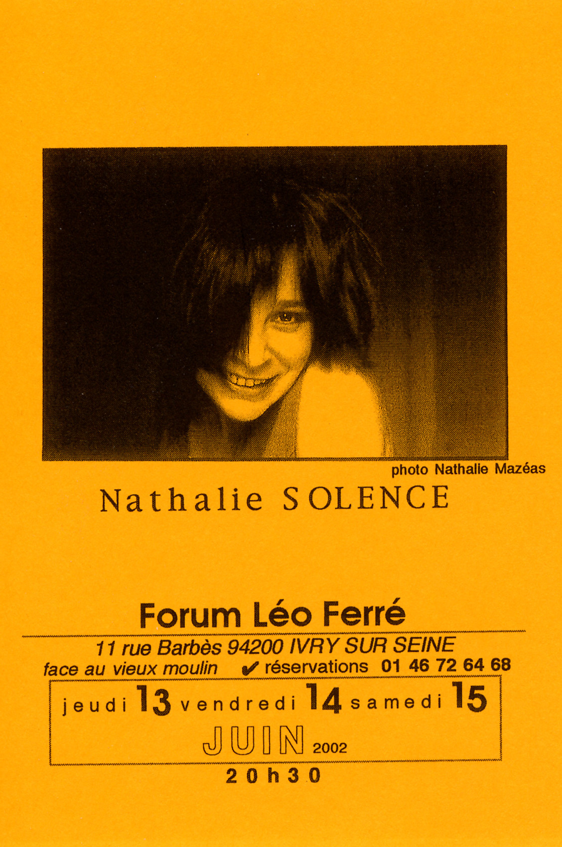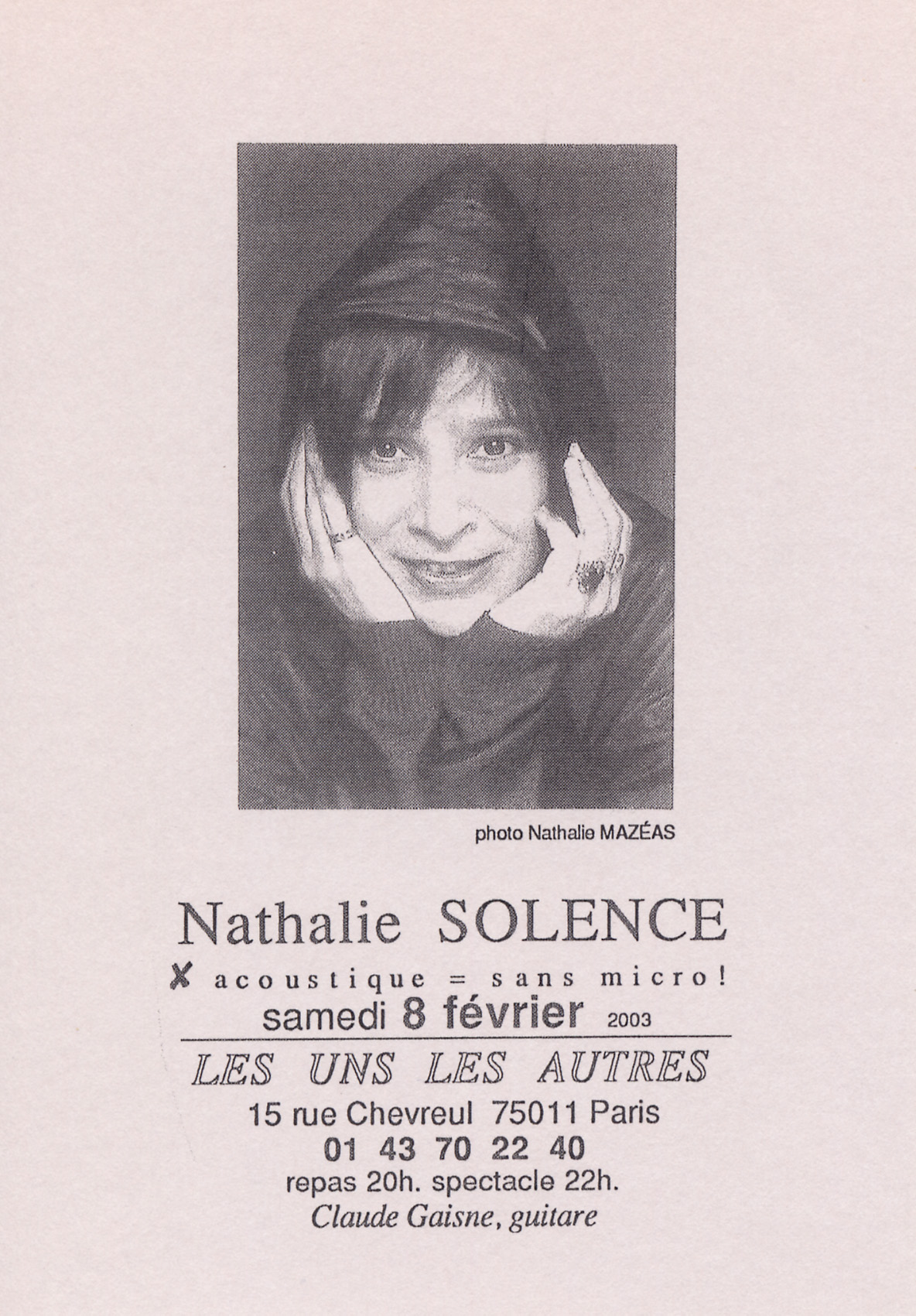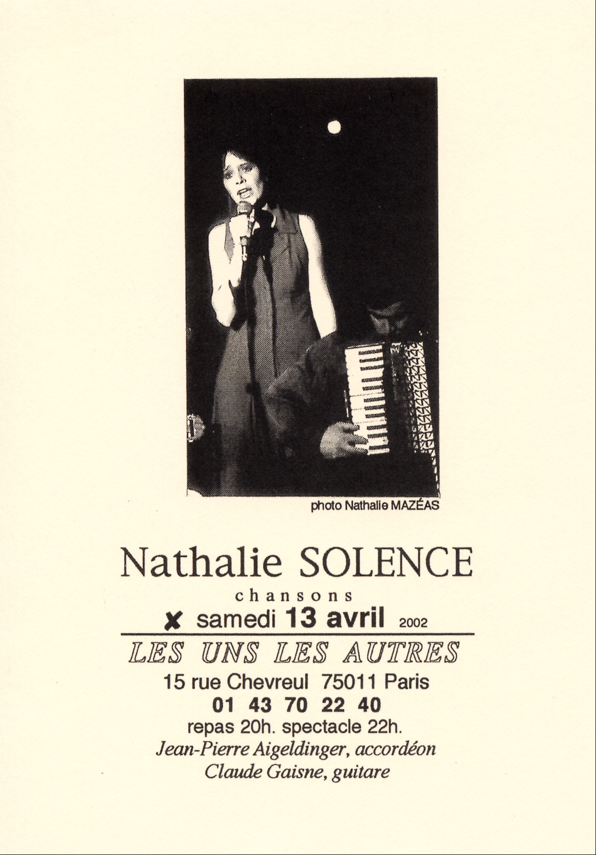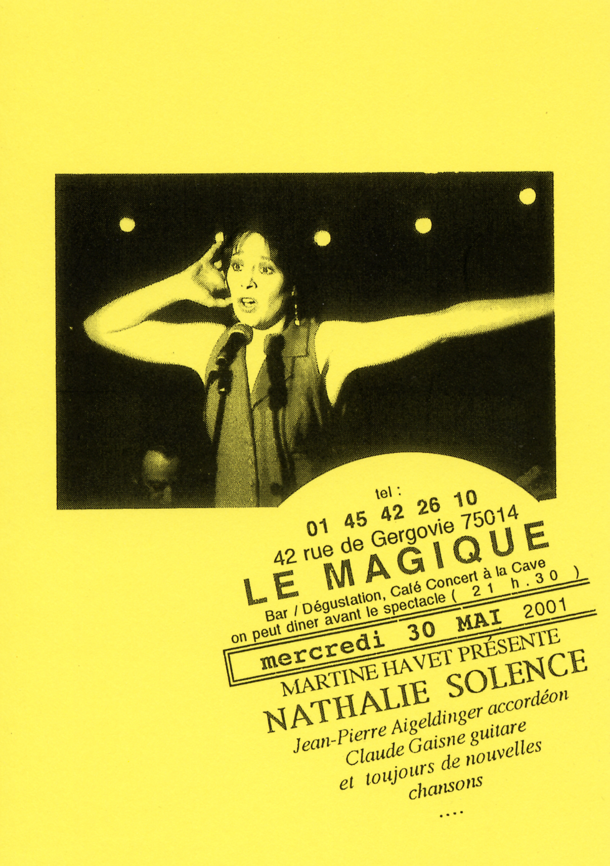 Itinéraire Gaston Couté, L’Atrium, Cluis (36), Le Lapin Agile, Les Uns les Autres, Le Magique, La Vieille Grille (Paris), 2001 – Théâtre des Déchargeurs (Paris), Cinéma l’écran (Saint-Denis), 2002 – Le Lapin Agile (Paris), 2003 – Meung-sur-Loire, 2006