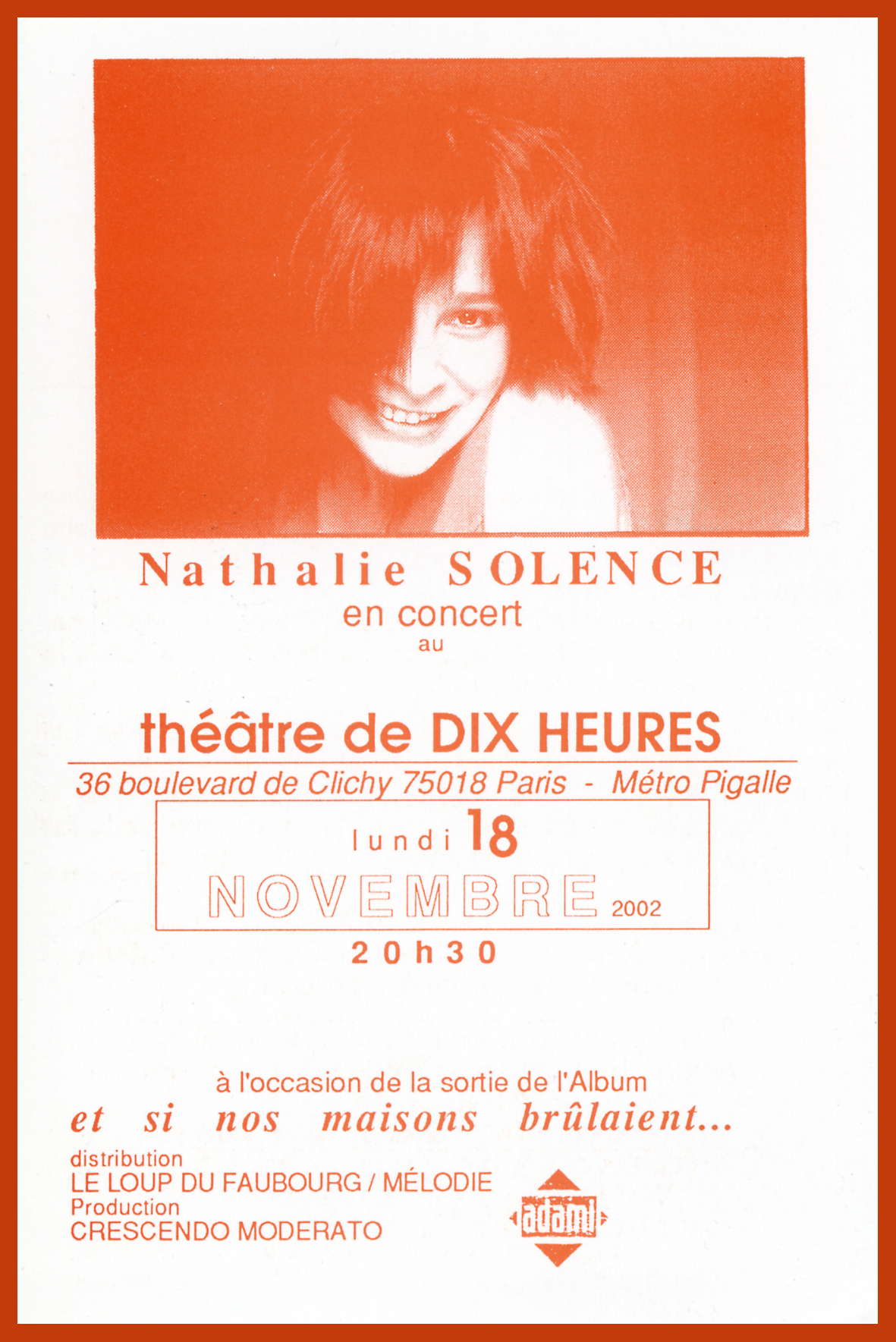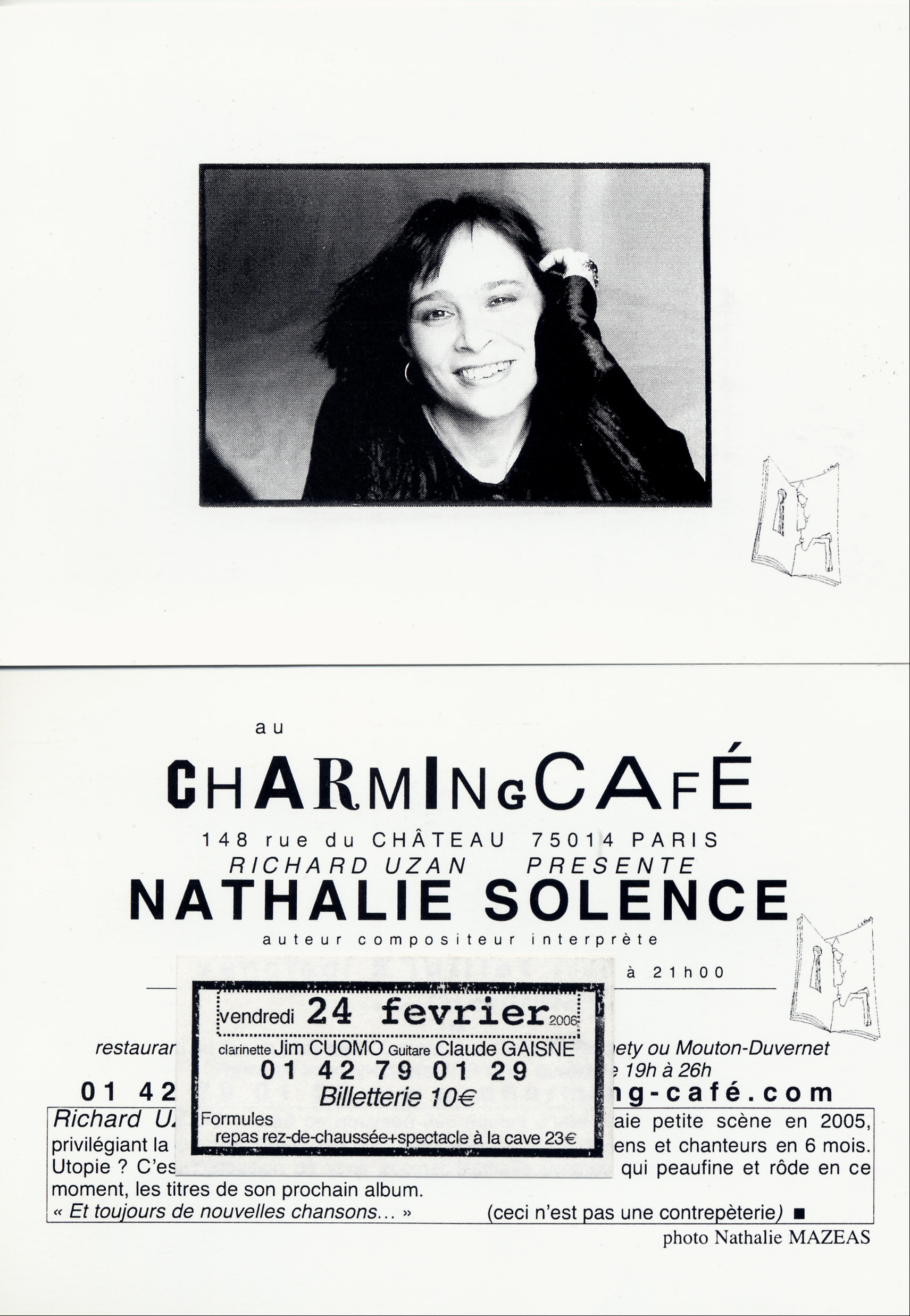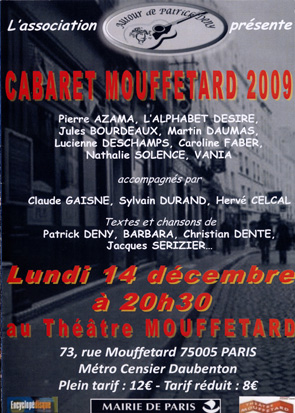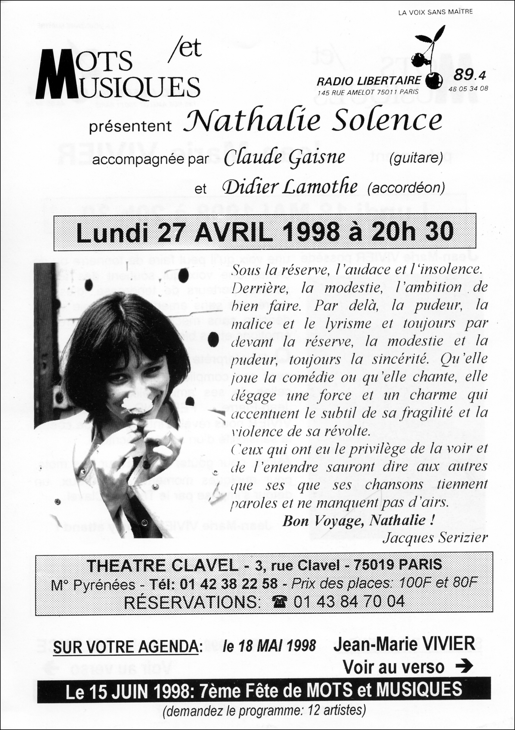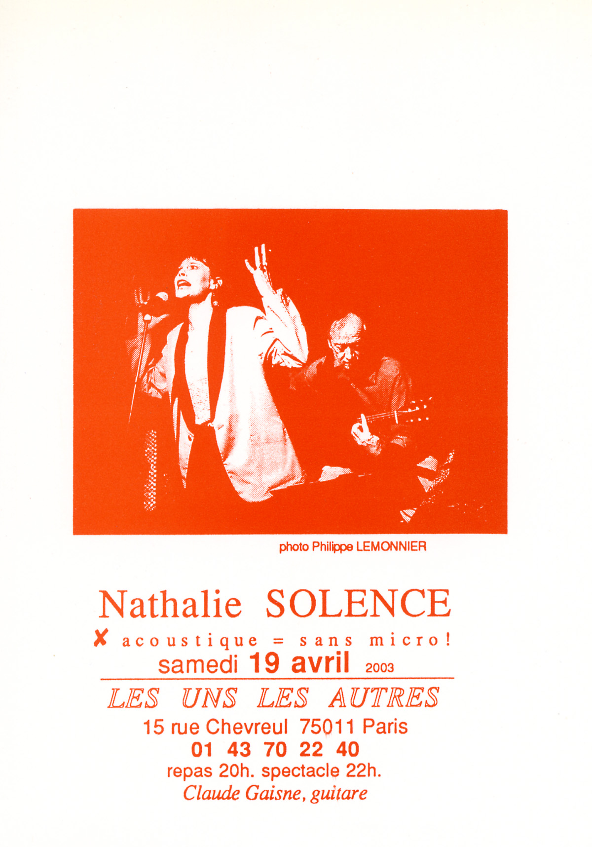 Itinéraire Gaston Couté, L’Atrium, Cluis (36), Le Lapin Agile, Les Uns les Autres, Le Magique, La Vieille Grille (Paris), 2001 – Théâtre des Déchargeurs (Paris), Cinéma l’écran (Saint-Denis), 2002 – Le Lapin Agile (Paris), 2003 – Meung-sur-Loire, 2006