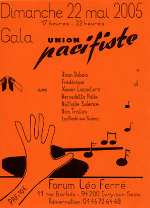 Galas de l’Union pacifiste : Le Club Dunois, 1996 – Cinquante ans de l’Union pacifiste, Vingtième Théâtre, 2011 – Forum Léo Ferré, 2003, 2011, 2013 – Merci Cabu, Imprimerie Expression 2, 2015 – Théâtre Trévise, 2017…