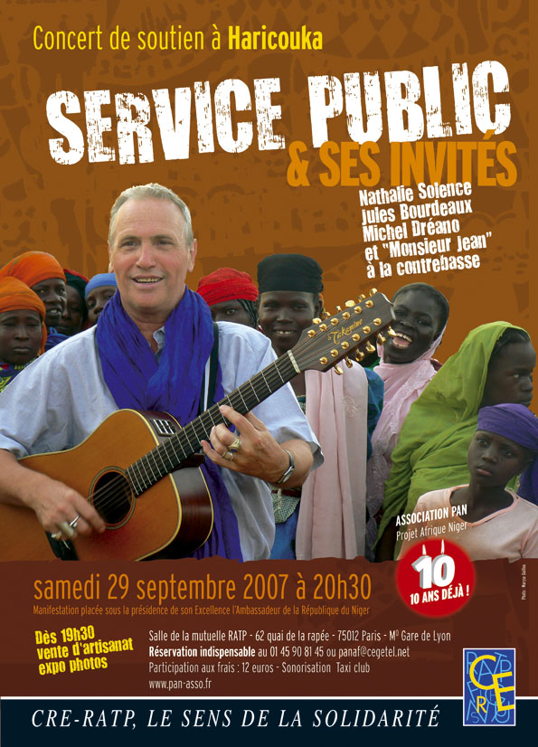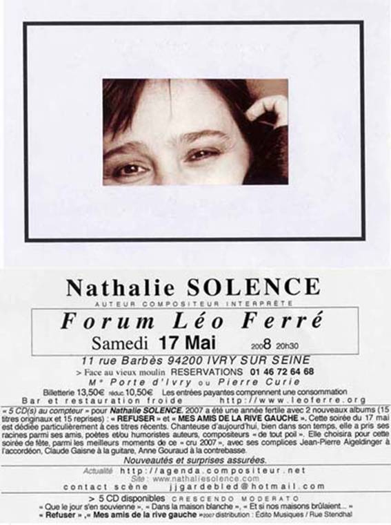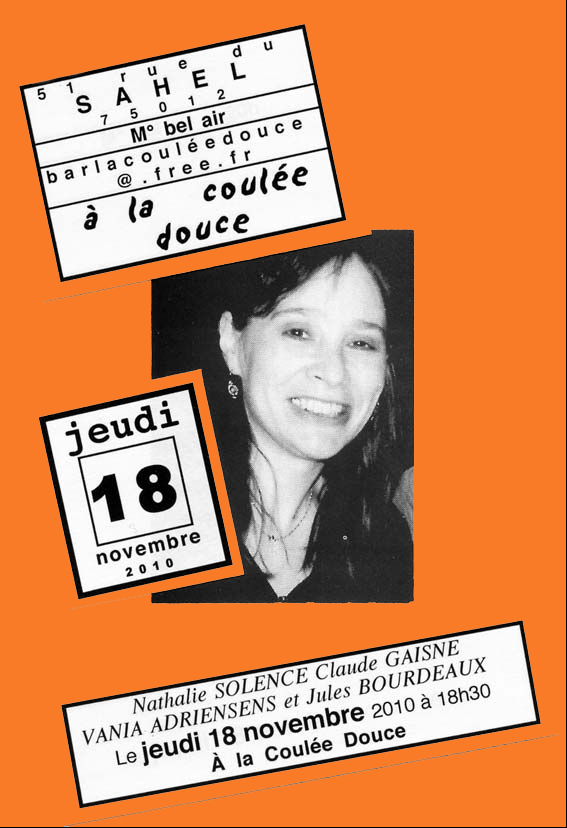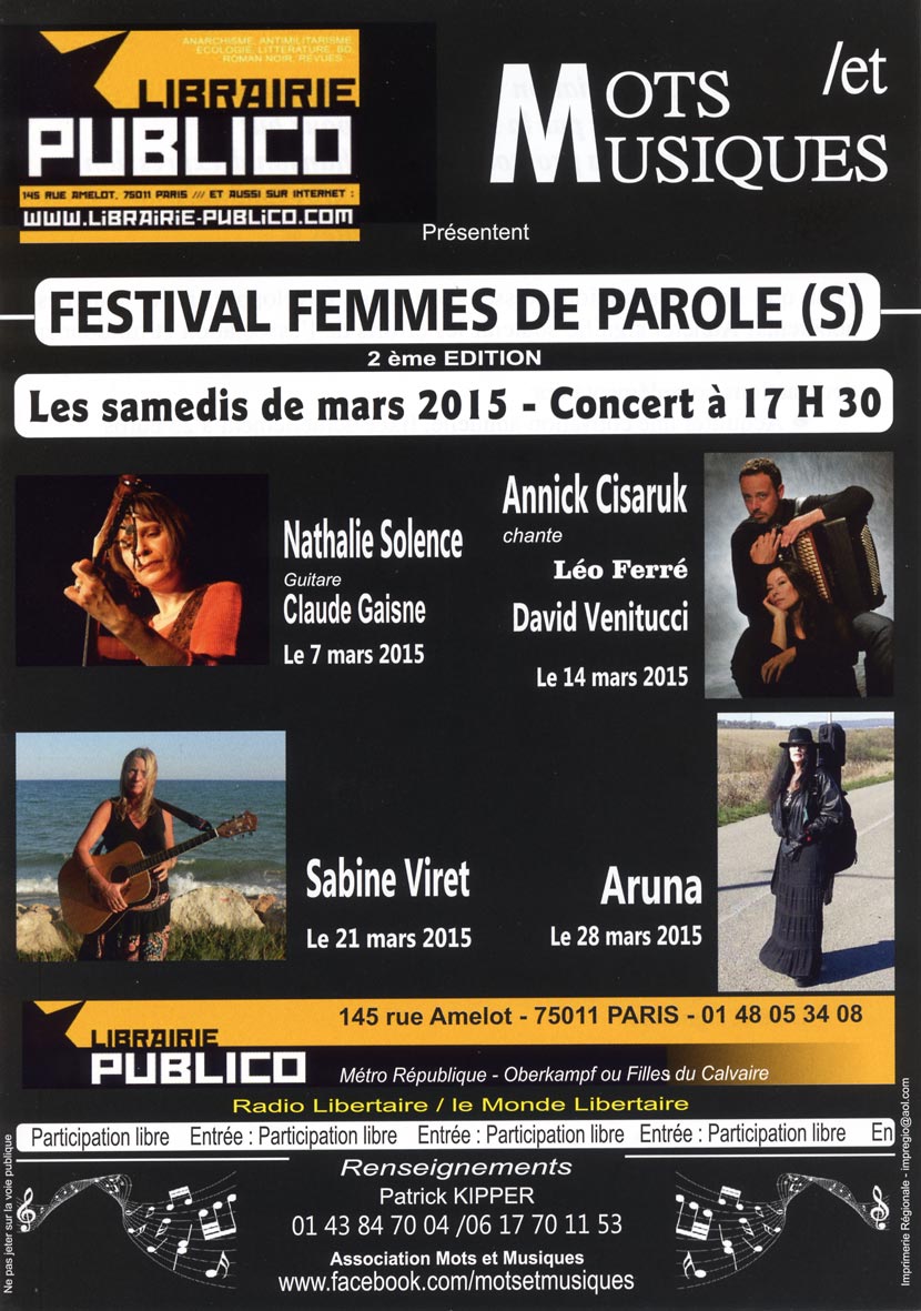 MJC Village (Créteil) – Forum Léo Ferré (Ivry) 2002, 2003, 2005, 2006, 2008 – Maison Audiberti (Palaiseau) – Café littéraire, Espace 93 (Clichy-sous-bois) – « La Fête dans la ville » (Arcueil) – Les Fontaines en Sologne (Vitry) – Les Artistes (Chambourcy) – La Crémaillère (Saclas) – MJC (Maincy) – Théâtre Paris Vincennes (Vincennes) – Théâtre Berthelot (Montreuil) 2001 – Fête de l’Humanité (La Courneuve) – Fête de Lutte Ouvrière (Presles) – Le CADA (L’Hay-les-Roses) – La Colombière (Briis-sous-Forges) – L’Espace François-Mauriac (Sevran) – Mairie (Saint-Mandé) – Centre Culturel (Forges-les-Bains) – India Café (Chambly) – Le Barrage (Pontoise) – Le Mondego (Le Kremlin-Bicêtre) – Aux saveurs d’ici et d’ailleurs (Maisons Alfort)…