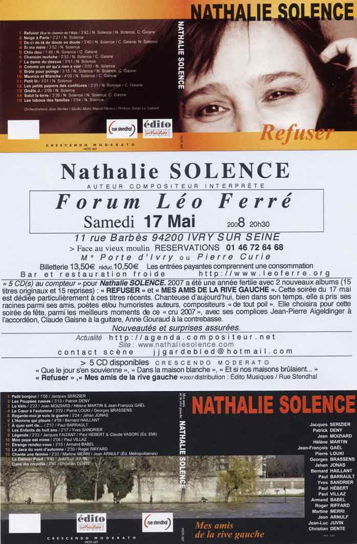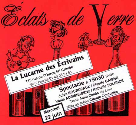 Éclats de verre Spectacle construit autour de la lettre d’un ancien buveur « Lettre à mes amis de vingt ans » d’Alain Callès et ponctué par une douzaine de chansons, avec Nathalie Solence, Vania Adrien Sens, Jules Bourdeaux, Claude Gaisne – mise en scène Claude Confortès – Représentations suivies d’un débat avec l’association Vie Libre et la Compagnie du Tournezinc – 2007 – Conservatoire Municipal de Musique et de Danse (CMMD), Stains, 2008 – Hôpital Georges Pompidou, Paris, 2010 – La Villette, Cité des Sciences, Paris, 2011 – La Lucarne des écrivains, Paris – Hôtel de ville, Montreuil – Dugny – Marly-le-Roi…