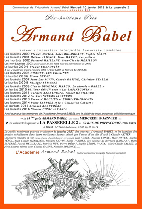 Prix Armand Babel : chaque année en décembre à Paris : La Vieille Grille, 1999 – Les Uns les Autres, 2000-2003 – Le Magique, 2004-2016 – La Passerelle 2, 2017